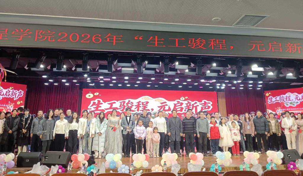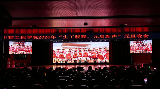 为营造辞旧迎新的节日氛围,丰富校园文化生活,增进师生、同学间的情感交流,12月30号晚,生物工程学院在图书馆南楼一楼文化艺术中心举办2026年“生工骏程,元启新声”元旦晚会。此次晚会由生物工程学院师生参加,新乡学院党委宣传部常务副部长苏辉、国家语言文字推广基地办公室主任兼教务处副处长张伟峰、学生处副处长兼学生资助中心副主任贾晓萌以及生物工程学院党政领导班子出席,张景、孙燕姿、李雨轩、程柄权四位同学主持。